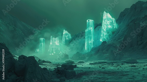 Mystical green glowing crystal formations in a dark, foggy mountainous landscape, creating an eerie and otherworldly atmosphere.