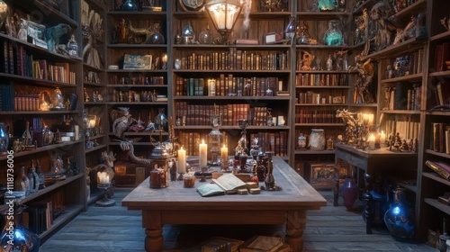 Mystical library interior with antique books, candles, and artifacts on wooden table and shelves.