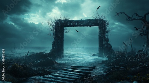 Mystical portal in moody scenery; dramatic sky, birds, and a stone gate