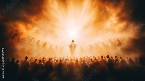Mystical Revelation Scene with Divine Entity and Worshiping Crowd