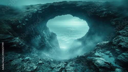 Mystical rock archway shrouded in fog, overlooking a dramatic landscape.
