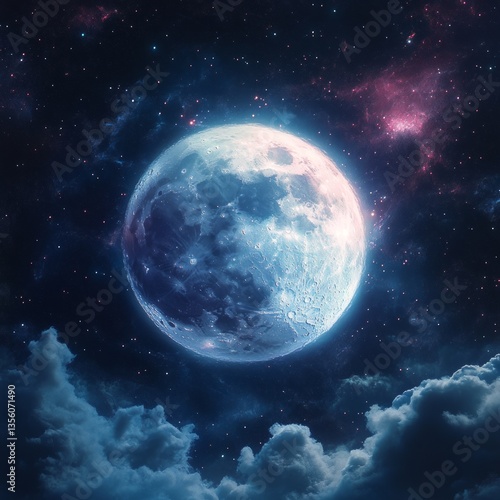 Mystical sky with a massive glowing moon, surrounded by swirling mist and vibrant stars, ethereal and captivating, photorealistic and immersive