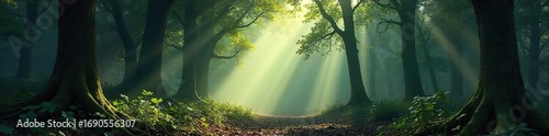 Mystical Sunbeams Dance Through Ancient Forest, Creating a Serene and Magical Atmosphere, Perfect for Fantasy or Nature Projects