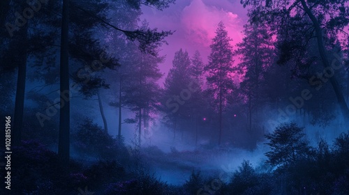 Mystical Twilight Glow in Dark Pine Forest with Neon Pink and Blue Adobe Color Themes