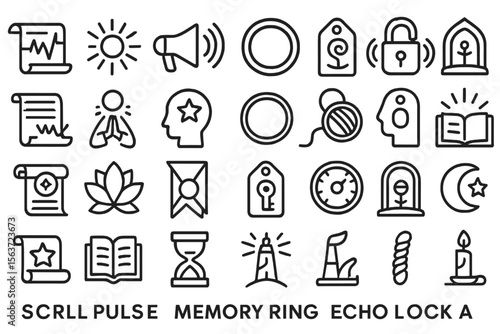 Mystical UI icon set featuring scrolls, meditation, symbols, and spiritual tools