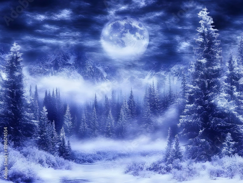Mystical Winter Wonderland: Snow-Covered Forest under the Majestic Full Moon with Fog and Mountains Background.