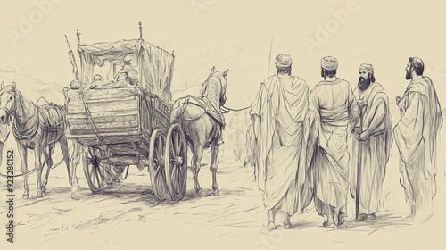 Naaman Arriving at Elisha's House for Healing, Expecting a Grand Reception, 2 Kings Biblical Illustration, Beige Background