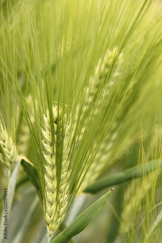 Nahaufnahme einer wunderschönen, unreifen Ähre einer Getreidepflanze im Sommer.