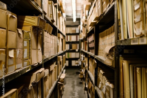 Narrow aisle stretching through dusty archives full of cardboard boxes containing documents
