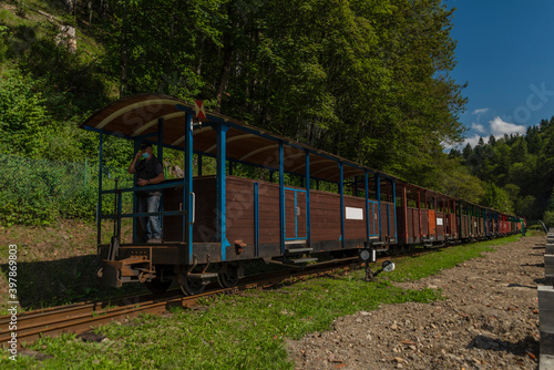 Narrow gauge railway in Majdan station with summer passengers in Poland