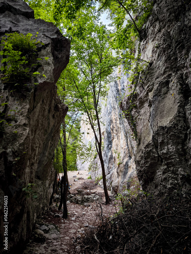 Narrow Pathway Between Rocky Cliffs Leading To The Nago Rock Climbing Area, Surrounded By Lush Green Trees
