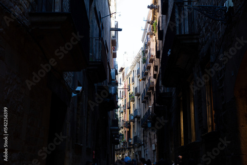 Narrow street with catalan flags flying in barcelona's gothic quarter