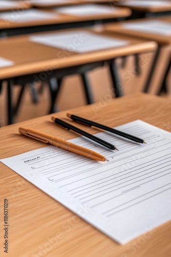 National Educational Support Professionals Day Classroom with empty desks and writing materials on wooden surface