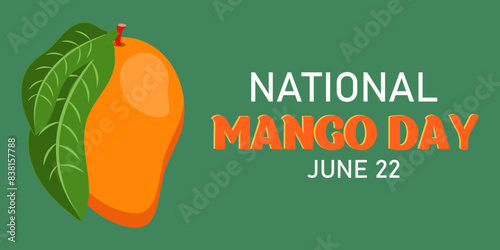 National Mango Day vector background with ripe mango and text. Whole ripe mango isolated on a green background flat illustration. Mango Day Poster, June 22. Important day. Hand drawn vector.