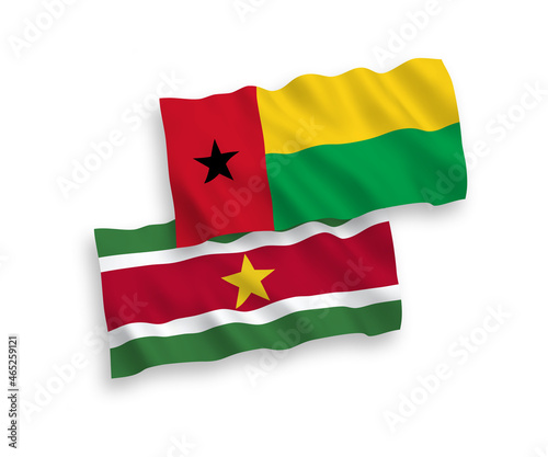 National vector fabric wave flags of Republic of Guinea Bissau and Republic of Suriname isolated on white background. 1 to 2 proportion.