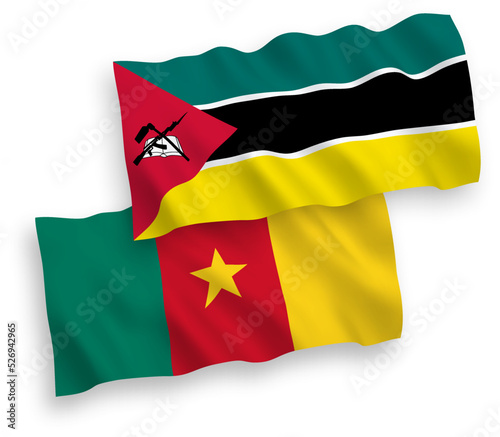 National vector fabric wave flags of Republic of Mozambique and Cameroon isolated on white background. 1 to 2 proportion.