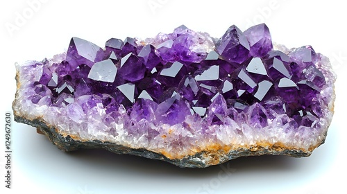 Natural amethyst crystal cluster formation with deep purple crystalline structures emerging from raw stone base, displaying geometric shapes and varying translucent tones.