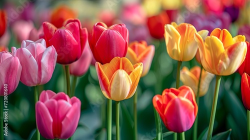 Natural background of vibrant tulips in full bloom, creating a colorful floral tapestry generative ai