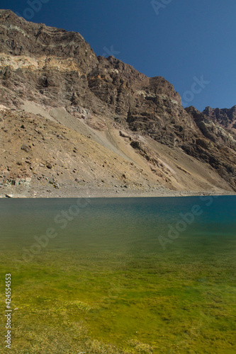 Natural background. View of the yellow shallows, blue water lake, rocky cliffs and mountains, high in the Andes cordillera in Chile.