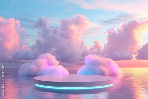 Natural beauty podium backdrop for product display with dreamy cloud and neon light background. Romantic 3d seascape scene. with generative ai