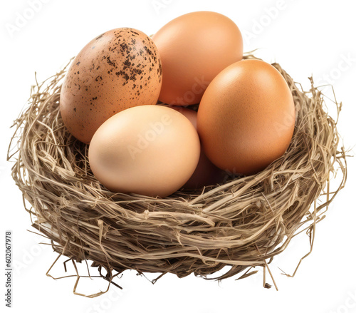 Natural, bio eggs lie in the nest. Eco-friendly chicken eggs in the nest. Isolated on transparent background. KI.