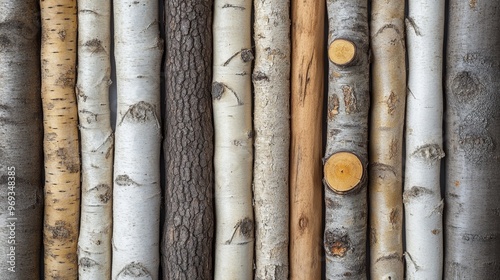 Natural birch wood logs arranged side by side, highlighting knotted textures and varied tones, creating a rustic swatch sample with organic charm