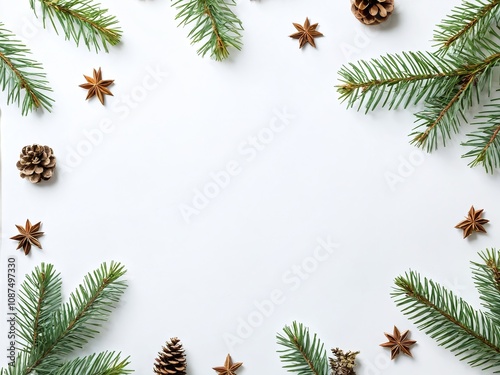 Natural decorations with pine branches and star anise on a white background for festive winter arrangements. Christmas and New Year