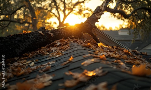 Natural disaster damage shown by tree collapse on home requiring urgent disaster response and recovery