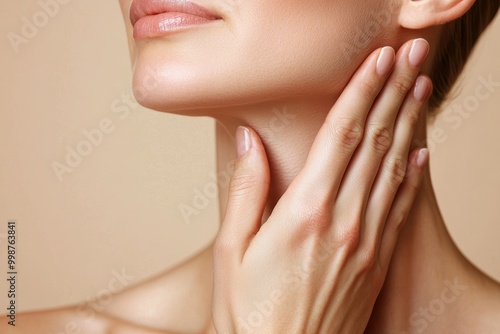 Natural Facial Massage with Soft Lighting on Glowing Complexion Emphasizing Smooth Jawline and Neck Bare Hands Neutral Beige Background for Skincare and Beauty Themes