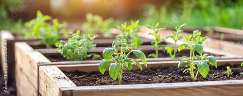 Natural fertilizer gardening idea. Vibrant seedlings growing in wooden planters under soft sunlight.