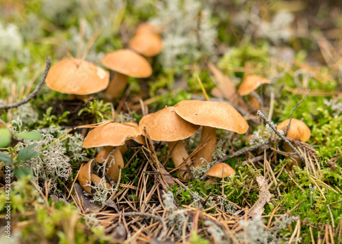 natural forest background, wild mushroom in the forest, traditional forest background with grass, moss, lichens and dry branches, autumn forest texture