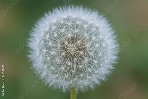 Natural fractal geometry reveals repeating patterns in nature. Close-up of a white, fluffy dandelion seed head against a blurred green background.