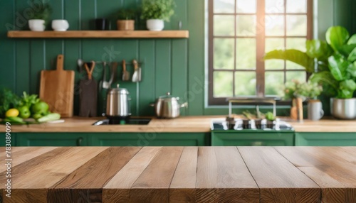Natural Harmony: Modern Green Kitchen Scene with Wooden Tabletop"