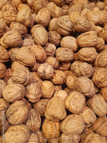Natural nuts in shell background. Bulk dried fruits. Whole unpeeled walnuts. many nuts in the market. Healthy and organic food. Natural fresh walnut full frame.