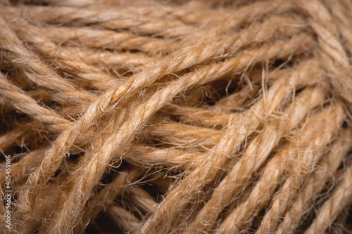 Natural rope twine textured background close up plan. Fibers in a mess rustic style
