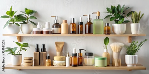 Natural Spa Shelf Decor with Plants and Bottles, bathroom decor, spa products, home decor, shelf styling