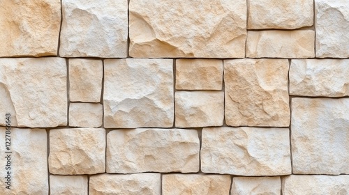 Natural stone wall featuring various textured blocks in light beige tones, showcasing craftsmanship and durability in architectural design