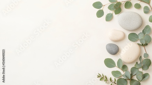 Natural stones and leaves arranged aesthetically on a light background, creating a serene and minimalist composition.