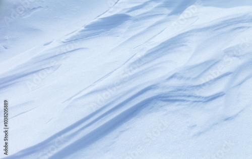 Natural winter texture of snow white crust on frozen Baikal Lake in cold day. Abstract white and blue snowy textured background in form of frozen waves. Blank, copy space, mock up, flat lay, top view