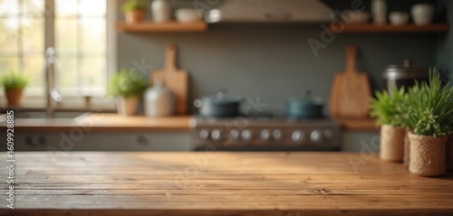 Natural wooden tabletop in rustic style. Blurred kitchen background with stove, sink and plants creates cozy atmosphere. Blank surface ready for product placement and food photography.