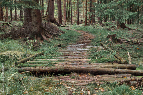 Nature pine forest with trail wooden road. Scandinavian forest in evening light. Nordic tree forest background. Travel concept. Landscape view.