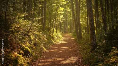 Nature trail and hiking path in forest. Forest scene with hiking path, straight trail through forest