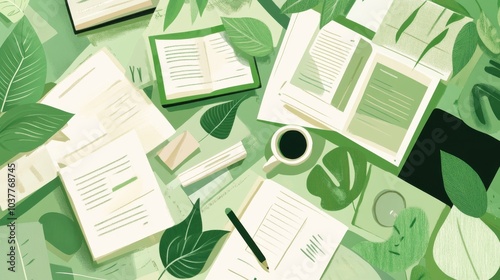 Nature-inspired Workspace with Books, Coffee, and Greenery