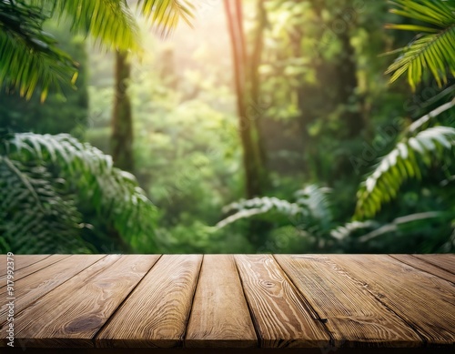 Nature’s Retreat: Empty Wood Table and Jungle Greenery