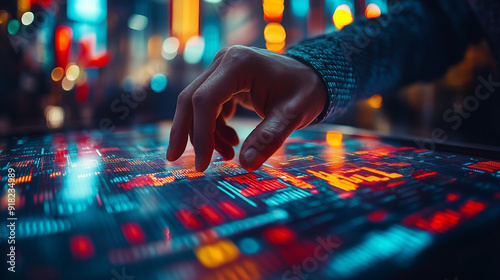 Navigating the Digital Landscape: A hand interacts with a vibrant, data-rich touchscreen display, illuminated by the city's glowing lights in the background. This image evokes a sense of exploration,