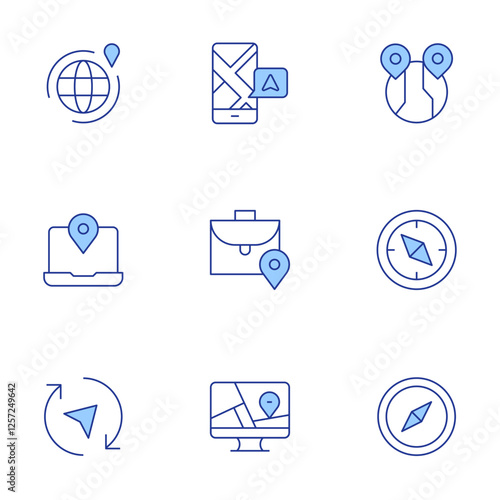 Navigation icons set. Line Duotone style, editable stroke. gps, pin, navigation, around the world, compass