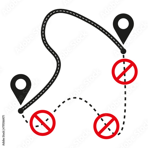 Navigational route with restrictions. GPS tracking path with prohibition signs. Vector illustration. EPS 10.