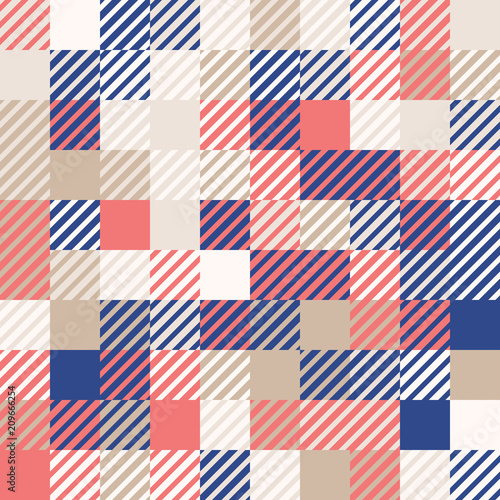 Navy blue, coral red and gold colors. Random colored abstract geometric mosaic pattern background