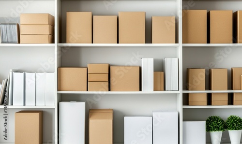 Neatly arranged cardboard boxes and white containers on shelves represent efficient storage and organization.