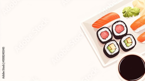 Neatly arranged sushi rolls featuring salmon and tuna with soy sauce and ginger